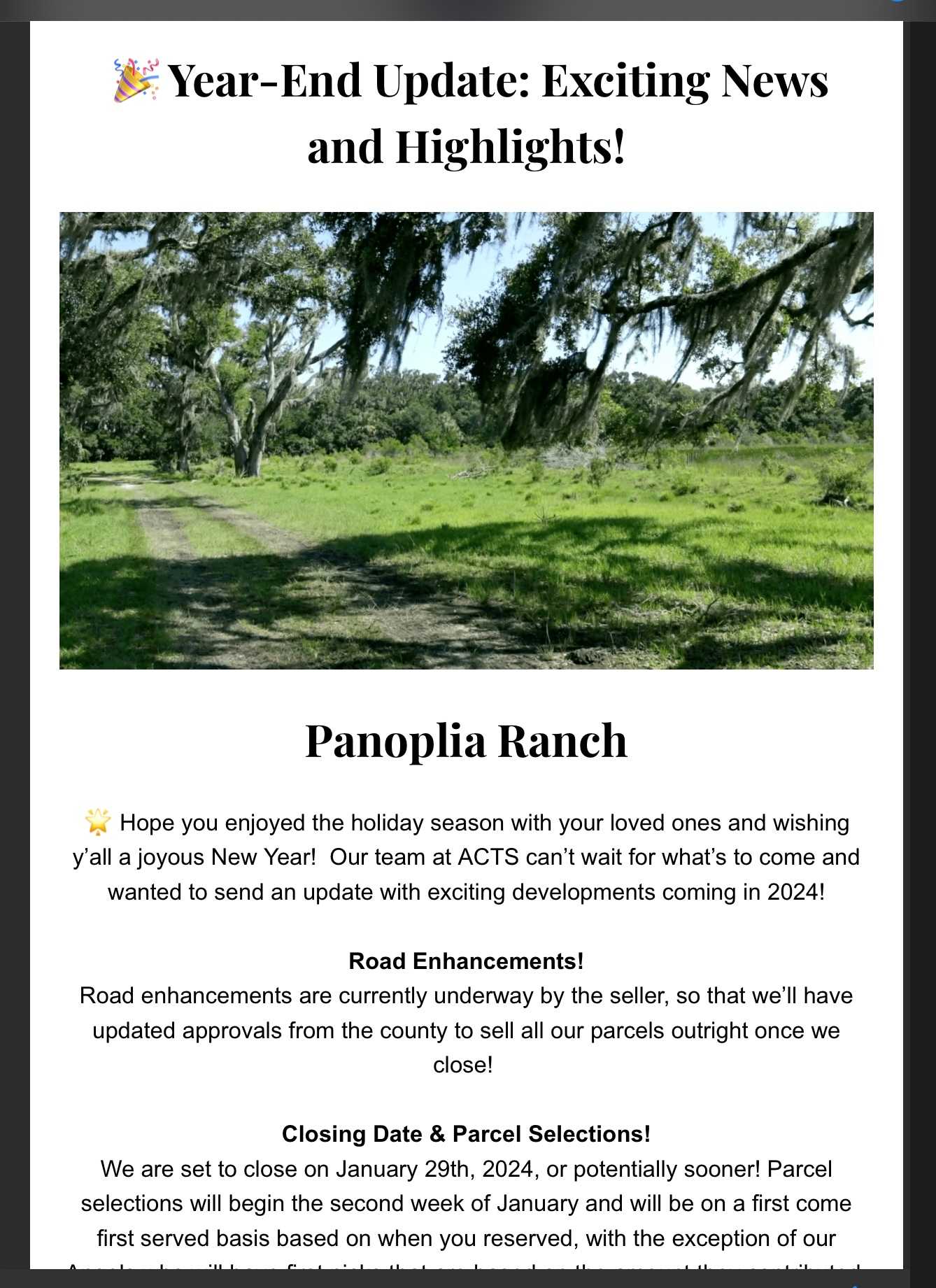 We began January with an exciting year end update from ACTs announcing road improvements, parcel selections, and a January 29th or sooner closing for Panoplia.